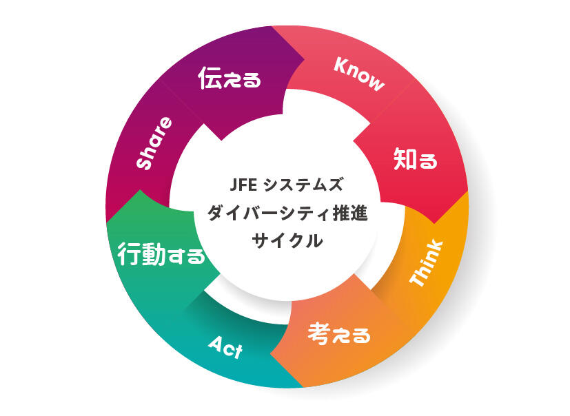 ダイバーシティ推進サイクル「知る→考える→行動する→伝える」の起点となる「知る場」を提供し、知って、考えて、行動し、将来的には社員一人ひとりが伝える立場になることで「ビジョンを具体化する仲間の輪」を広げます。